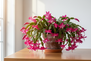 Christmas Cactus terra cotta pot. Traditional and great for indoor holidays. Give it in-direct sun and water.