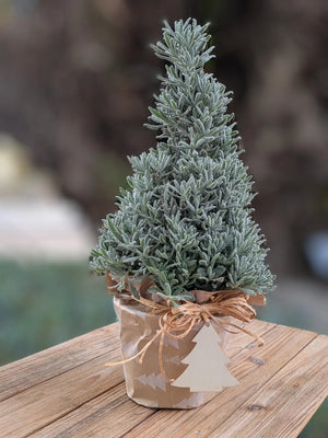 Lavender Tree in a terra cotta pot. Incredible scent and great for indoor holidays. Not hardy. Give full sun. Water when dry. Does not like wet roots.