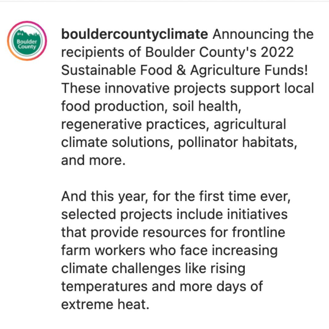 “We are thrilled to be a large-fund recipient of the Sustainable Food & Agriculture Fund,” said Lisa Suarez-Tadus, owner of Mariposa Farm. “The money will help establish a high-density apple orchard generating fresh produce, juice, and wines for our new community here in Boulder County.”